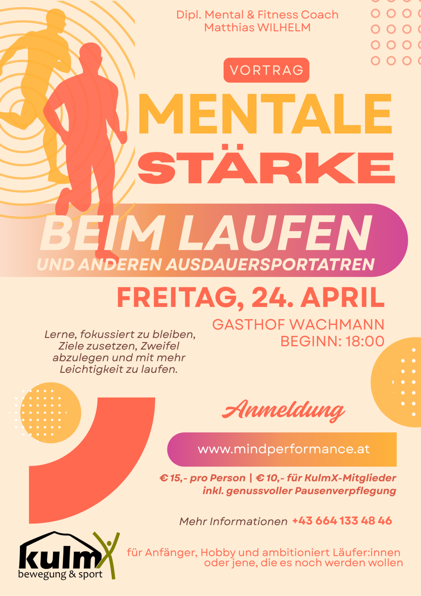 Der Vortrag richtet sich an, aber nicht ausschließlich, Ausdauersportler:innen, die nicht nur körperlich, sondern auch mental stärker werden und ihr volles Potenzial abrufen möchten.